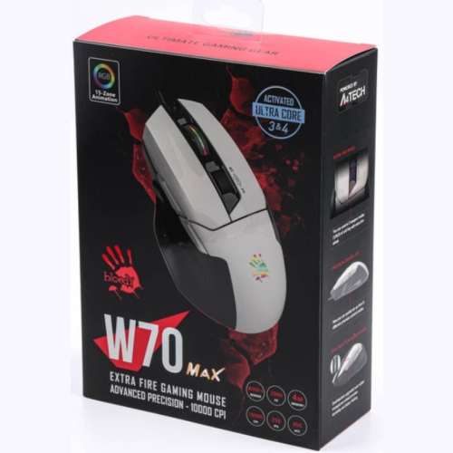 BC3332-A 10K SensorSa profesionalnim 10.000 CPI, 8000 FPS , 250 IPS i 35G ubrzanjem, miš daje igracima preciznu kontrolu na ekranu u brzim FPS igrama poput CS: GO.2000 Hz Report RatePrebacivanje izmedu dostupnih 125, 500, 1000, 2000 Hz najbolje odgovara vašim igrackim sesijama.4 tipa LOD prekidac za podešavanjePrilagodite razdaljinu kako biste se uklopili sa igrackim navikama. Prilagodite LOD koji vam najbolje pruža tacnost i upravljivost.Podrazumevano 5 RGB svetlosnih efekata5 Vrste svetlosnih efekata su unapred ucitane. Podesite svetlosne efekte podizanjem miša i pritiskom na 1 za rotiranje.Extra Fire WheelMožete kontrolisati 3 režima oružja (1 / N / 3) Precision Control KeySada možete brzo da podesite 6 razlicitih režima precizne kontrole.SNAGA. KONTROLA. BRZINA. PRECIZNOST.Dizajniran da redefiniše standarde tacnosti i brzine, ovaj sjajni motor za miša slama konkurenciju. Dizajniran da vam pruži prednost u intenzivnom igranju. Sa Bloody uredajima reagujete brže i uvek ste korak ispred svojih protivnika.Senzor: MAX BC3332-A 10K senzorRezolucija: 100 ~ 10 000 CPIBrzina: 8000 fpsUbrzanje: 35 gTracking Speed: 250 ipsReport Rate: 125 ~ 2000 HzKey Response: 1 msTrajnostMikro prekidac: Preko 50 miliona klikova (levo / desno dugme)Tocak: Preko 500 000 klikaMetalni X'Glide Armor Boot: Preko 300 kmhttps://www.itsvet.com/gembird_predstavlja_a4tech_bloody_w70_max_za_gejmere-pcaa1-.i?id=216469-------------------------------------------------------------------------------------------------------------------------------------------------------------------------RECENZIJA:A4TECH Bloody W70 MAX, jako lep mis, na prvi pogled deluje jako kvalitetno sto i jeste, kvalitet izrade je na visokom nivou, u nekom trenutku deluje kao da je ceo od metala ali zapravo je od plastike. Sam polozaj ruke je izuzetno prirodan, nisam imao nelagodnosti koristeci ga ako bi se moglo tako reci "udoban" je za koriscenje, svaki prst nadje svoje mesto i to puno znaci u nekim duzim seansama gaming-a ili klasicnoj upotrebi. Ima siroki spektar podesavanja. Uz program koji se moze skinuti sa oficijalnog sajta software.bloody.com, dobijate mogucnost podesavanja 4 razlicita moda."Core 1" ili prvi mod daje mogucnost najklasicnije upotrebe bez ikakvih mogucnosti upotrebi dodatnih tastera na samom misu poput "Sniper Rifle" koji kad zadrzite samo dugme, spusta sensitivity misa na vrednost koju vi zadate u samom programu, jako korisna alatka prilikom igranja FPS igara koje poseduju precizan i realistican gameplay samih snipera pa u trenutku zooma hocete precizno da nanisanite neprijatelja, nezavisno od moda ili “Core” u kome se nalazite, “Sniper Rifle” mod radi u svakom trenutku. Takodje tu je i dodatni scroll pored standarnog, koji prilikom skrola na gore, aktivirate prvu funckiju, skrolom na dole drugu funkciju a samim pritiskom vracate na default. Funkcija skrola zavisi od moda ili “Core” koji odaberete.“Core 2” ili drugi mod, prilikom sekudarnog skrola ili tako da ga nazovemo mod skrola na gore, omogucavamo double click ili sto bi u igri bilo “2 burst shots” koji se manifestuje tako sto prilikom samo jednim klikom, na primer u FPS igri, puska ispali 2 metka. Prilikom skrola na dole, omogucavate triple click ili u igri “3 burt shots” koji radi isto sto 2 burst samo jednik klikom ispali 3 metka.Kupovinom W70 max dobijate PRO verziju samog softvera tako da su vam Core 3 i Core 4 automatski aktivirani i omoguceni.“Core 3” daje jako zanimljiviju i itekako korisnu funkciju za profesionalne FPS igrace igara poput CS GO. Skrolom sekundarnog skrola na gore ili dole omogucavate takozvani “Spray Control” koji se manifestiuje dugim klikom levog klika ili drzanje samog klika, sam kursor ili nisan se spusta sam od sebe ka dole tako da dok pucate iz neke puske, puska koja trza, mod koji ste aktivirali omogucava kontrolu trzaja puske.“Core 4” vam daje potpunu slobodu i kontrolu nad misem tako sto svaki taster mozete vi sami da podesite sta ce u datom trenutku da radi. Odlicna i jako korisna funckija za Gamere ili ljudi kojima je potrebna brza precica do nekog programa ili neke funckije kao i podesavanje macro funkcija.W70 Max je prelep mis zbog samog RGB svetla koji je programibilan, Bloody7 softver vam omogucava detaljna podesavanja RGB animacija samog misa. Menjanje RGB moda (poseduje 6 razlicitih modova) se moze vrsiti i na samom misu prilikom odvajanja misa sa same podloge i u vazduhu, dakle sam senzor optike ne sme kaciti podlogu, stiskanjem sekundarnog skrola menjate nacin na koji ce se RGB svetla manifestovati.Sto se tice sensitivity-a ili osetljvost i preciznost misa, reklo bi se da je to “next level”, ogroman spektar podesavanja sto hardverski na samom misu, prilikom stiskanja dva tastera na donjem delu misa “R-Hz” I “LOD” koji vam omogucavaju najfinija podesavanja koja su vam potrebna za sto bolji gaming performans ili precizan video ili photo editing. Takodje imate mogucnost i u samom softveu da podesavate brzinu ili sensitivity kao i “Response” time.Zakljucak, ovaj mis vredi mnogo vise po mom misljenu, meni barem tako deluje, na oko deluje kao neki mis od 100 i vise evra, takodje i sam spektar funkcija i cinjenica da je RGB, takodje daje utisak da je rec o dosta skupljem misu. Sve preporuke za ovaj proizvod.