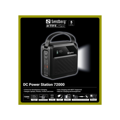 Sandberg DC Power Station 72000 is your mobile power hub, with a capacity of 72,000 mAh / 270 Wh. You get two powerful 100W USB-C PD ports, two USB-A QC3.0 ports with up to 22W, and a 12V DC output, so you can charge your laptop, tablet, phone, and much more. All five outputs can be used simultaneously! It comes with both male and female adapters for the car's 12V socket, so you can easily connect car equipment, a cooler, or a pump directly. Supports charging via both USB-C and solar panel (MPPT) through the DC input. With a built-in LED lamp, you're ready for anything from camping to power outages.