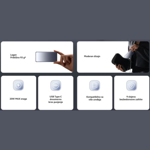 Tip: Prenosni bežični punjačFormat: IonKapacitet: 5.000mAhPunjive: DaVoltaža: 3.88VPriključci: 1x USB-CDimenzije: 113mm x 53mm x 10mm*Pogodno za putovanje avionom: Usklađeno je sa međunarodnim vazduhoplovnim standardima, naime, radi se o jednom prenosnom uređaju za punjenje čiji je kapacitet manji od 100 Wh.*Punjenje do 39% i 37% za 30 minuta: Brzina punjenja može varirati u zavisnosti od korišćenja uređaja i uslova punjenja, između ostalih faktora.*Punjenje uređaja niskom strujom: Takođe podržava punjenje niskom strujom za Bluetooth slušalice koje nisu brenda Xiaomi, pametne narukvice i druge uređaje.*Potpuno punjenje za 1,75 sati: Ovo je ostvarivo kada se koriste Mi 20W Charger (Type-C) i USB kabl koji su uključeni u pakovanje. Mi 20W Charger (Type-C) mora se kupiti zasebno.