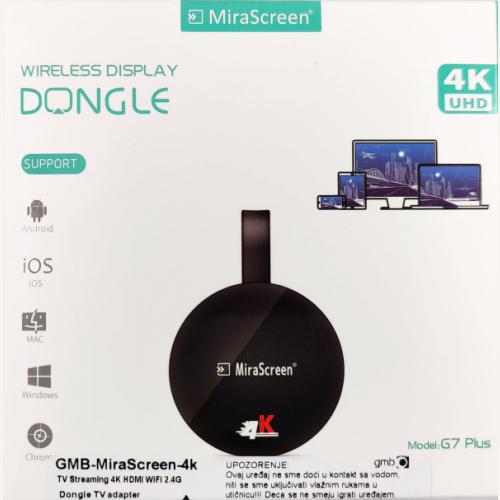 MiraScreen Wireless DisplayG7 Plus 2.4Ghz 4K UHD karakteristike:-Bežicni ekran: Miracast adapter za bežicni ekran prenosi video/audio/igre/sliku itd. sa racunara/tableta/telefona na HD ekrane.-Visoke performanse: Miracast kljuc za TV sa ugradenim 2.4G wifi modulom, podržava bežicni ekran za onlajn i lokalni sadržaj.-Kompatibilnost: Airplay HDMI dongle radi sa Androidom 5..0+/MacOS 10.9+/iOS 8.0+/Windows 8.1/10, ali nije kompatibilan sa aplikacijama koje imaju zaštitu autorskih prava na "HDCP" video kao što su Netflik, Amazon Video, HULU itd.-Široka upotreba: uredaj za preslikavanje ekrana sa prenosivim dizajnom, pogodan za putovanja, kuc´nu zabavu, deljenje slika; može se koristiti i za vaš automobil (HDMI ulazni port)Model: G7 PLUSWireless: 2.4GTezina: 30,6gBoj: CrnaFunkcije: Airplay, Miracast, DLNAVelicina: 63x63x15mmCPU: AM8272