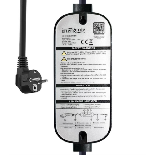 Ovaj mobilni kucni punjac je pogodan za sva vozila koja na strani automobila imaju Type 2 (Mennekes) prikljucak.Na strani utikaca za napajanje nalazi se standardni Schuko Type-F utikac koji se može prikljuciti u obicnu 230V uticnicu.Ekstra dugacak kabl, savršen ako je uticnica za punjenje malo udaljenija od vašeg automobila.Mobilni EV punjac sa LCD ekranom – 16A / 3.7 kWPodesiva snaga punjenja (6/8/10/13/16 A), idealno za vikendice i kampovePraktican LCD ekran prikazuje detaljan status punjenja i temperaturuOmogucava odloženo (zakazano) punjenje (maks. 10 sati odlaganja)Inteligentna zaštita od greške uzemljenja, prenapona, podnapona i pregrevanjaIP65 vodootporno kucište omogucava upotrebu kabla u svim vremenskim uslovimaUlazna snaga: 250 V~ 16 A, 50–60 Hz (3.7 kW)Maksimalna struja: 16 A (3.7 kW)Podešavanja struje punjenja: 6 A, 8 A, 10 A, 13 A, 16 AFaze: 1-fazni prikljucakStepen zaštite: IP65 (kontrolna kutija), IP55 (EV utikac – kada je povezan)Utikac – strana punjaca: Schuko (muški)Utikac – strana vozila: Type 2 (Mennekes) ženskiKabl – strana punjaca: 3G2.5 mm² (0.5 m)Kabl – strana vozila: 3G2.5 mm² + 1 x 0.5 mm² (9.5 m)Ukupna dužina: 10.0 m