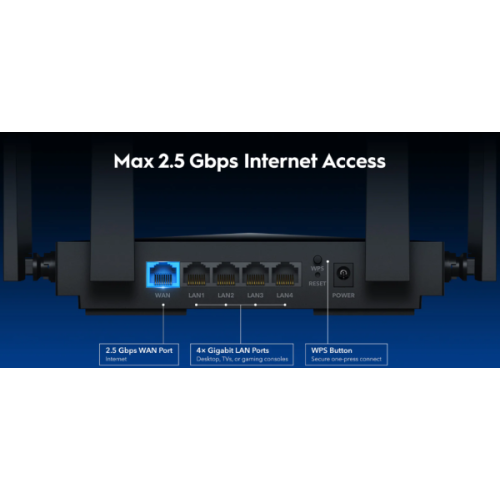 Verzija modela: WR3600H 1.0CPU Èipset: BCM6764Detalji CPU-a: 2,0 GHz četvorojezgarni, ARM Cortek-A7Memorija/Skladištenje Flash/ROM: 128 MB (1 Gbit) NANDDDR/RAM: 512 MB (4 Gbit) DDR3LWireless 5 GHz Wi-Fi brzina: 2882 Mbps2,4 GHz Wi-Fi brzina: 688 Mbps5 GHz Wi-Fi strimovi: 2T2R (2×2 MIMO)2,4 GHz Wi-Fi strimovi: 2T2R (2×2 MIMO)Wi-Fi antene: 4× fiksnoMaksimalno pojačanje antene od 5 GHz: 5,5 dBiMaksimalno pojačanje antene od 2,4 GHz: 5,4 dBiFEM ili PA/LNA: 5 GHz: 2× eksterno; 2,4 GHz: 2× InterniBeamforming: TrueMaksimalne performanse dometa: - 220 m (722 ft)- Unutarnji WiFi opseg varira u zavisnosti od rasporeda i materijala zidova. Pogledajte specifikacije performansi zida za predloge za postavljanje.Performanse zida:- Dva drvena zida debljine < 10 cm (4'')- Jedan betonski zid debljine < 20 cm (7'') ili dva betonska zida debljine < 10 cm (4'')Interfejsi 2.5G RJ45 portovi: 1Gigabitni RJ45 portovi: 4Eternet napomene: 2.5G port je WAN port, a gigabitni portovi su LAN portoviLED: - Power- Internet- WAN- LAN- 2,4 GHz Wi-Fi- 5 GHz Wi-FiFizička dugmad: WPS dugme, Dugme za resetovanjeUlaz za napajanje: DC JackPower Power Methods: DCDC: 12V 1AUlaz adaptera za napajanje: 100 ~ 240 V, 50/60 Hz ACIzlaz: 12V 1A DCMaksimalna potrošnja energije (W): 10WPouzdanost Okruženje Radna temperatura: 0 C ~ 40 C (32 F ~ 104 F)Temperatura skladištenja: -40 C ~ 70 C (-40 F ~ 158 F)Vlažnost: 10% ~ 90% bez kondenzacijeVlažnost skladištenja: 5% ~ 95% bez kondenzacijeSertifikati: FCC, CEMehanička instalacija: Desktop, Montaža na zidDimenzije uređaja: 183,3×109×38 mm; 7,22×4,29×1,5 inčaDužina antene: 175 mm, 6,89 inčaTežina proizvoda: 332,0 g (11,71 oz.)Sadržaj paketa VR3600HPover AdapterEthernet CableUputstvo za instalaciju