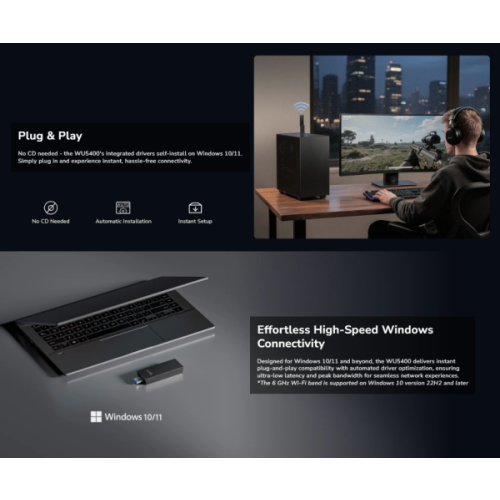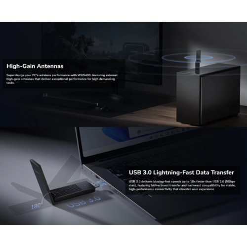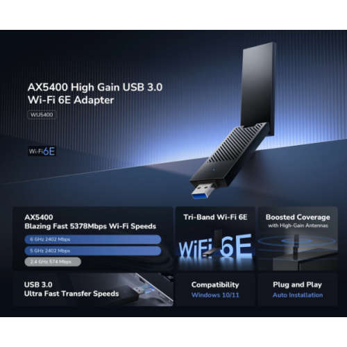 Visokoperformantni Wi-Fi adapter koji unapreduje vaš racunar naprednom tri-band Wi-Fi 6E konekcijom. Frekvencijski opseg od 6 GHz pruža izuzetno nisku latenciju, što ga cini idealnim za online igranje.-Tri-band Wi-Fi 6E-2,4 Gbps + 2,4 Gbps + 574 Mbps WiFi 1-USB 3.0 za munjevito brzi prenos podataka-Kompatibilan sa Windows 10/11Sistemske specifikacije:-Verzija modela: WU5400 1.0-Bežicna veza – Wi-Fi standardi: Wi-Fi 6E-Maksimalna Wi-Fi modulacija: 1024-QAM-Wi-Fi efikasnost: -OFDMA -MU-MIMO -BSS ColorMaksimalna širina Wi-Fi kanala: 160 MHzWi-Fi bezbednost: WPA/WPA2/WPA3Drajveri: Automatska instalacija za Windows 10/11Hardverske specifikacije:Bežicni (Wireless):-Brzina Wi-Fi 6 GHz: 2402 Mbps-Brzina Wi-Fi 5 GHz: 2402 Mbps-Brzina Wi-Fi 2.4 GHz: 574 MbpsWi-Fi tokovi (Streams):-6 GHz: 2T2R (2×2 MIMO)-5 GHz: 2T2R (2×2 MIMO)-2.4 GHz: 2T2R (2×2 MIMO)Wi-Fi antene: 2Interfejsi: LED, SistemPouzdanost / Okruženje:-Radna temperatura: 0 - 40 stepena C -Temperatura za skladištenje: -40 - 70 stepena C-Vlažnost: 10% ~ 90% bez kondenzacije-Vlažnost pri skladištenju: 5% ~ 95% bez kondenzacijeZahtevi:-Hardverski zahtev: Potreban USB 3.0 ili viši standard USB porta za punu brzinu-Kompatibilni OS: Windows 10/11 ili noviji-Instalacija drajvera: Automatska instalacija drajvera na Windows 10/11-Wi-Fi opseg od 6 GHz podržan je samo na Windows 10 verzija 22H2 i novijimSertifikati: FCC, CEMehanicki:-Dimenzije: 29.9 × 13.2 × 88.8 mm (1.18 × 0.52 × 3.5 inca)-Težina proizvoda: 24.7 g (0.87 oz)Sadržaj pakovanja:-WU5400-Uputstvo za instalaciju