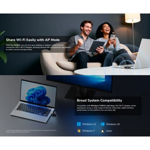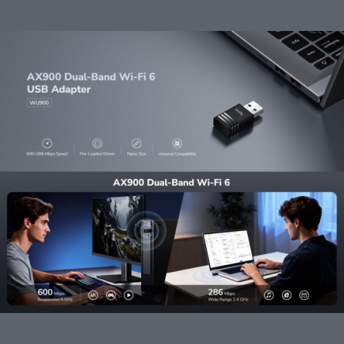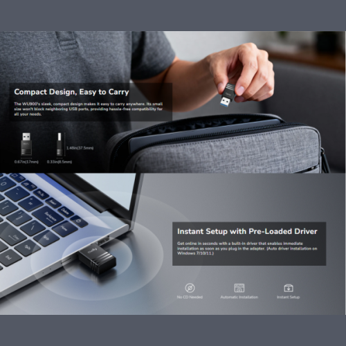 -Kompaktan USB adapter sa dvostrukim opsegom koji podržava Wi-Fi 6, pružajuci visokobrzinski rad sa niskom latencijom za glatko online igranje i brza preuzimanja na vašem gejmerskom PC-u ili laptopu.-Dvostruki opseg Wi-Fi 6-600 Mbps + 286 Mbps Wi-Fi-1× USB 2.0-Dimenzije: 37,5 × 17 × 8,5 mm (1,48 × 0,67 × 0,33'')Verzija modela: WU900 1.0Bežicne karakteristike:-Brzina Wi-Fi 5 GHz: 600 Mbps-Brzina Wi-Fi 2.4 GHz: 286 Mbps-Wi-Fi strimovi 5 GHz: 1T1R-Wi-Fi strimovi 2.4 GHz: 1T1R-Wi-Fi antene: 2Pouzdanost / Okruženje:-Radna temperatura: 0 ? ~ 40 ? (32 ? ~ 104 ?)-Temperatura skladištenja: -40 ? ~ 70 ? (-40 ? ~ 158 ?)-Vlažnost: 10% ~ 90% bez kondenzacije-Vlažnost pri skladištenju: 5% ~ 95% bez kondenzacijeZahtevi uredjaja:-Hardverski zahtevi: Potreban USB port standarda 2.0 ili noviji za punu brzinu-Kompatibilni OS:** -Windows 7/10/11 -Linux Kernel 3.10~6.8 -UOS -Kylin OS V4 i V10Instalacija drajvera:-Automatska instalacija drajvera na Windows 7/10/11-Rucna instalacija drajvera za druge operativne sistemeSertifikati: FCC, CEMehanicke karakteristike:-Dimenzije: 37,5 × 17 × 8,5 mm (1,48 × 0,67 × 0,33 inca)-Težina proizvoda: 5,0 g (0,18 oz)Sadržaj pakovanja:-WU900-Vodic za instalaciju