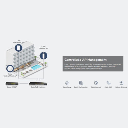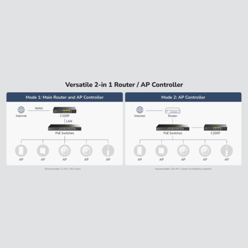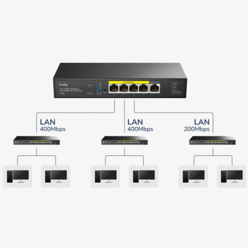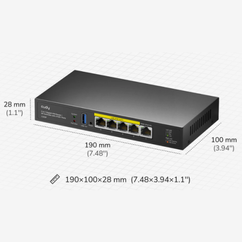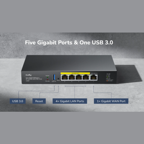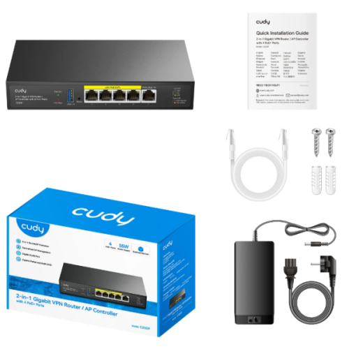 Gigabit ruter koji funkcioniše kao kontroler za Cudy pristupne tacke u sistemu Wi-Fi za citav dom, sa cetiri PoE izlaza i Cudy Mesh funkcijama.Verzija modela: C200P 1.0CPU: Detalji CPU-a: 880 MHz Dual-CoreMemorija / Skladištenje:-Flash/ROM: 16 MB (128 Mbit) NOR-DDR/RAM: 256 MB (2 Gbit) DDR3Interfejsi:-Gigabit RJ45 portovi: 5-Gigabit RJ45 PoE portovi: #2~#5-Maksimalna snaga na jednom PoE portu: 30W-Napomena za PoE portove: PoE portovi su u skladu sa IEEE 802.3at/af standardima-Ethernet napomene: 1× WAN port, 4× LAN portova-USB-A 3.0 portovi: 1-LED: Status PoE Max, Link/ACT/PoE status za svaki PoE portFizicki tasteri: Reset tasterNapajanje:-Ulaz za napajanje: DC prikljucak-Metode napajanja: -DC -802.3at/af PoE -Pasivni PoE-DC: 54V 1.11A-Pasivni PoE: 24/48V-Adapter za napajanje: -Ulaz: 100 ~ 240 V, 50 Hz AC -Izlaz: 54V 1.11A DCMaksimalna potrošnja energije:-PoE: 55W-PoE (kada je USB uredaj prikljucen): 50W-Bez PoE: 5W-Potrošnja u praznom hodu (W): 2W-Pouzdanost: -EMS: IEC/EN 61000-4-2, Nivo 3 -ESD: Kontakt: 6kV; Vazduh: 8kVOkruženje:-Radna temperatura: 0 - 40 stepena C-Temperatura skladištenja: -40 - 70 stepena C-Radna vlažnost: 5% ~ 95% bez kondenzacije-Vlažnost skladištenja: 0% ~ 100% bez kondenzacijeMetode uzemljenja: Uzemljivacka tackaSertifikati: FCC, CEMehanika:-Instalacija: -Stolna (Desktop) -Zidna montaža (Wall-mount)-Materijal kucišta: Metal-Dimenzije: 190 × 100 × 28 mm (7.48 × 3.94 × 1.1 inca)Sadržaj paketa:-C200P-Adapter za napajanje-Ethernet kabl-Uputstvo za instalaciju-Montažni setSoftverske specifikacije:WAN režim-DHCP-Staticka IP adresa-PPPoEPreporucen broj pristupnih tacaka (AP):-Glavni ruter i AP kontrolerski režim: 10-Samo AP kontrolerski režim: 200** Ako se koristi funkcija eksternog portal servera, preporucuje se upravljanje sa manje od 200 AP-ova.Preporucen broj klijenata:-Glavni ruter i AP kontrolerski režim: 100-Samo AP kontrolerski režim: Nema ogranicenja od strane kontrolera