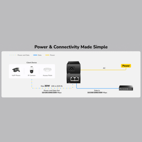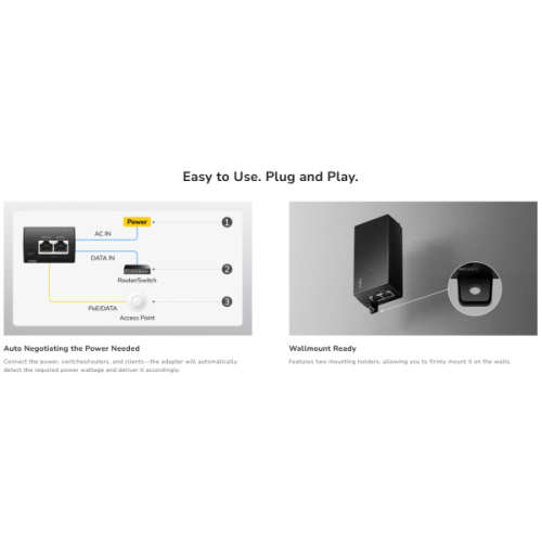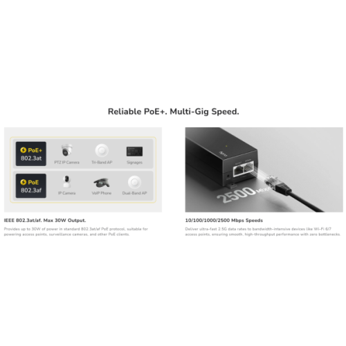 Adapter za napajanje preko mrežnog kabla (PoE) za montažu na zid, koji ubrizgava do 30W snage u Ethernet kabl kako bi napajao PoE uredaj.-Ulaz: 2,5GbE, Izlaz: 2,5GbE-Maksimalna udaljenost prenosa: 100 m-Standardi: 802.3at/af, Maksimalno 30W, Režim A-Zaštita od prenapona i ESD-LED indikator napajanja, LED indikator statusa PoEModel: POE200H 1.0Protokoli:-802.3-802.3i – 10 Mbps preko uparenih žica-802.3u – 100 Mbps preko uparenih žica-802.3ab – 1 Gbps preko uparenih žica-802.3bz – 2.5 Gbps preko uparenih žica-802.3af – PoE-802.3at – PoEPoE:-Uplink (prenos prema mreži): 1× 2.5GbE-Downlink (prenos prema uredaju): 1× 2.5GbE, 802.3at/af-Pin raspored za Downlink: Mode ARastojanje prenosa:-Kablovi kategorije 5e ili viši: 100 metara za Gigabit-Kablovi kategorije 5e ili viši: 100 metara za 2.5 Gbps-Napomena: Ukupna dužina kabla od uplink switch-a preko PoE adaptera do downlink uredaja racuna se kao jedan segment.Interfejsi:-Fizicki tasteri: Reset dugme-LED indikatori: PowerNapajanje:-Ulaz: AC Inlet-Metode napajanja: AC-Ulazna snaga: 100–240V~ 50/60Hz 0.8A-Maksimalna izlazna snaga: 30W, 54V, 0.56APouzdanost i zaštita:-Zaštita od prenapona-ESD zaštita-Zaštita od preopterecenja-Zaštita od kratkog spojaEMC standardi:-IEC/EN 61000-4-2, nivo 3 ESD: Kontakt: 6kV; Vazduh: 8kV-IEC/EN 61000-4-5, iznad nivoa 4 Prenaponi: Power: DM 4kV, CM 4kV; RJ45: CM 4kVOkolina rada:-Temperatura rada: -10 - 40 stepena C-Temperatura skladištenja: -40 - 70 stepena C-Vlažnost rada: 10%~90% bez kondenzacije-Vlažnost skladištenja: 10%~95% bez kondenzacije-Sertifikati: FCC, CEMehanika i instalacija:-Montaža: Desktop ili zidna montaža-Dimenzije: 123 × 51 × 35 mm (4.84 × 2.01 × 1.38 inca)-Materijal kucišta: Plastika-Težina proizvoda: 150 g (5.29 oz.)Sadržaj paketa:-POE200H-Strujni kabl-Montažni komplet-Uputstvo za instalaciju