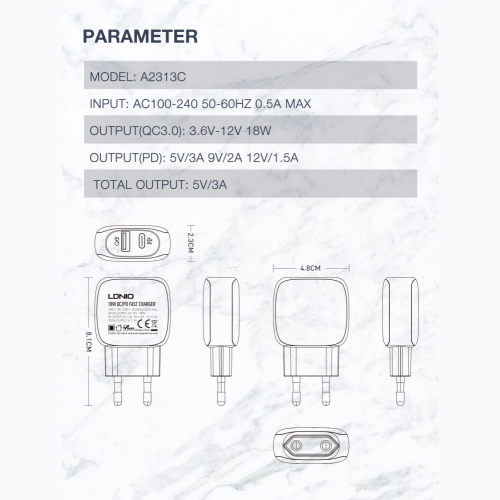 1. Ulaz:100-240V, 50-60Hz;2.PD fast charger Type-c izlaz: 5V/3A or 9V/2A or 12v/1.5A3. QC3.0 fast charger izlaz: 5V/3A or 9V/2A or 12v/1.5A