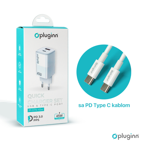 KUCNI PUNJAC PLUGINN PI-D74-45W, GAN, QC3.0, PD3.0, PPS, USB 19W, PD 45W SA PD TYPE C KABLOM BELI CE