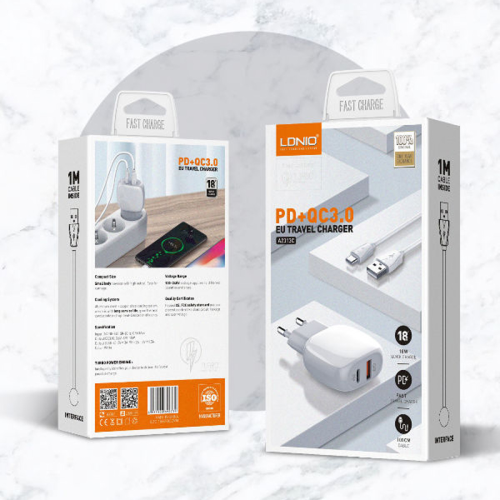 Kucni punjac LDNIO A2313Q PD + QC3.0 sa Type C kablomFast ChargerInput: 100-240V, 50-60Hz 0.5AOutput QC3.0: 3.6/6V-3A, 6.2/9V-2AOutput PD: 5V-3A, 9V-2A, 12V-1.5ATotal power: 18W